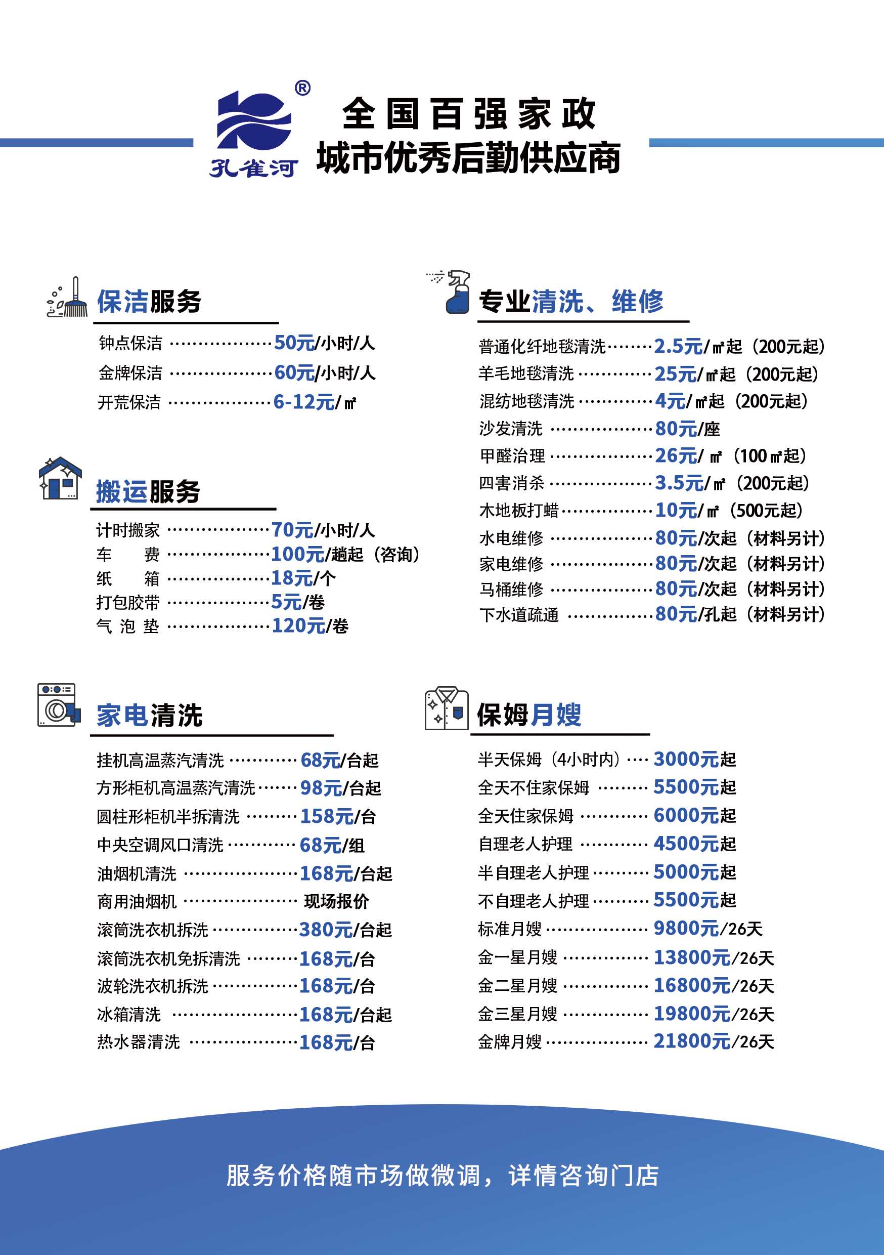孔雀河家政服務參考價格表